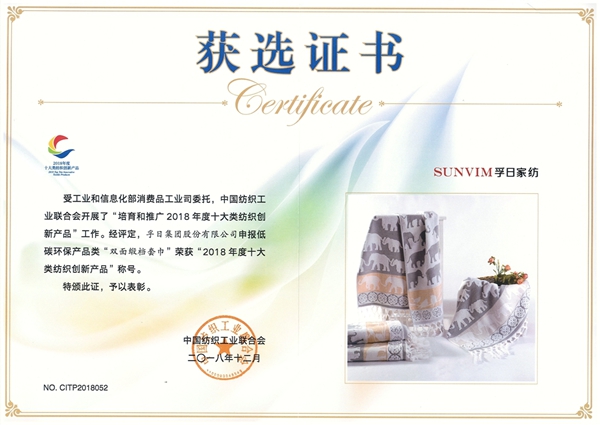 2018年12月11日,以“大變局 新格局:趨勢(shì)與展望”為主題的中國紡織創(chuàng)新年會(huì)在北京舉行。孚日集團(tuán)憑借在技術(shù)創(chuàng)新、產(chǎn)品研發(fā)等方面的探索和成績,入選首批“中國紡織行業(yè)工業(yè)設(shè)計(jì)中心”,并榮獲“中國紡織聯(lián)合會(huì)產(chǎn)品開發(fā)貢獻(xiàn)獎(jiǎng)”,“雙面緞檔套巾”和“鏤空遠(yuǎn)紅外印花床品”上榜“2018年度十大類紡織創(chuàng)新產(chǎn)品”。