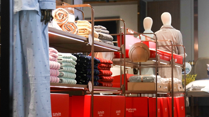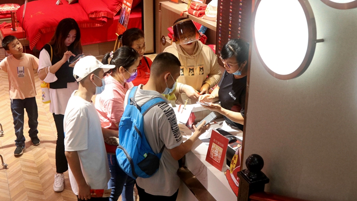 到店有禮,人流如織,邁入孚日家紡店門,一片片中國(guó)紅映入眼簾,一組組婚慶家紡琳瑯滿目,顧客瞬間沐浴在一片濃情化不開(kāi)的喜慶氛圍之中。